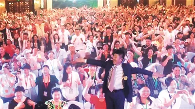 ▲2018年6月初,“创造丰盛”北京盛典现场,主持人鼓励大家“挥动翅膀,参与共振”。图源新京报。
