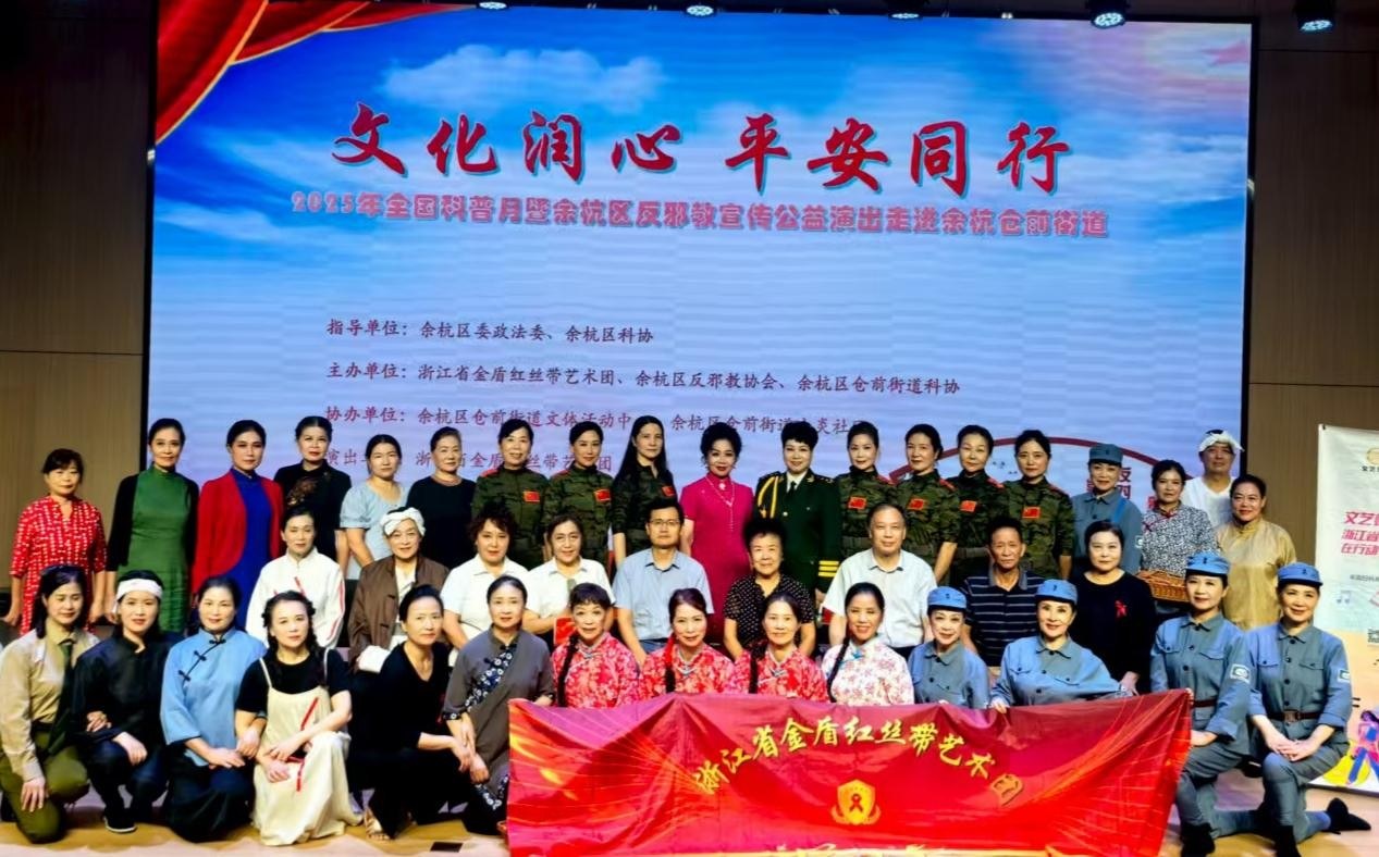 近日,由杭州市余杭区委政法委和余杭区科协指导,浙江省金盾红丝带艺术团、余杭区反邪教协会、余杭区仓前街道科协主办,仓前街道文体活动中心和仓前街道太炎社区协办的“文化润心、平安同行”——2025年全国科普月暨余杭区反邪教宣传公益文艺演出活动,在仓前街道文体活动中心剧场举行,120余名群众现场观看。