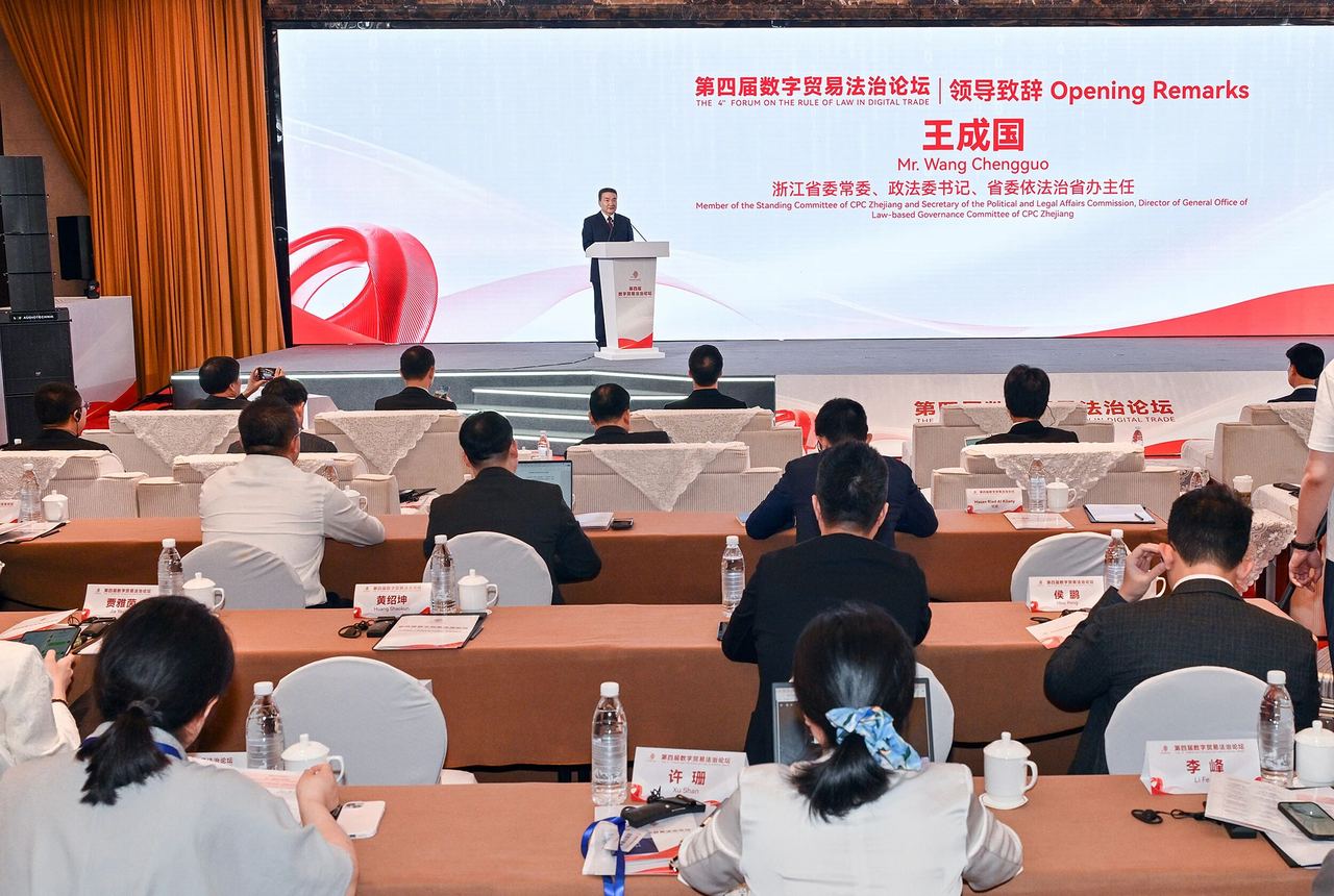 9月26日,由浙江省委全面依法治省委员会办公室指导,浙江省商务厅、浙江省司法厅、中国国际私法研究会、浙江工商大学共同主办的第四届数字贸易法治论坛在杭州开幕。来自联合国国际贸易法委员会、海牙国际私法会议、国际统一私法协会等国际组织、国内外法学界和浙江省相关部门的代表和嘉宾齐聚一堂,围绕“全球数字贸易规则的制订与中国贡献”主题分享经验、交流认识。浙江省委常委、政法委书记、省委依法治省办主任王成国,联合国国际贸易法委员会秘书长安娜·茹班-布雷,国家商务部条约法律司二级巡视员(副司长级)田涯,中国国际法学会会长、中国国际私法研究会会长黄进致辞。浙江省委依法治省办副主任、省司法厅厅长戴纪主持。