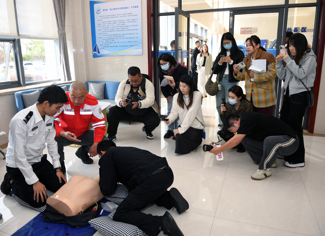 普陀区海上融治理中心工作人员告诉采访团记者,海上矛盾纠纷有着“动态管理难、发现处置难、源头预防难、调处化解难”等难题,“针对这些问题,2023年12月,我们通过整合海上治理部门资源、社会力量,建立起集多元化解、诉讼服务、信息指挥于一体的海上融治理中心。”
